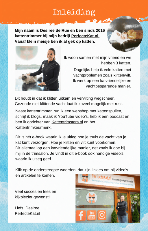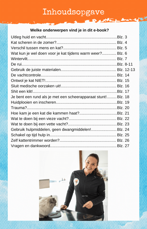 Dit boek bestaat uit 27 makkelijk te lezen bladzijdes. Boordevol direct toepasbare tips, handige uitleg video’s, directe links naar bruikbare producten en extra informatie. Na het lezen van dit boek ben je vol motivatie om zelf aan de slag te gaan om de vacht van je kat te verzorgen.